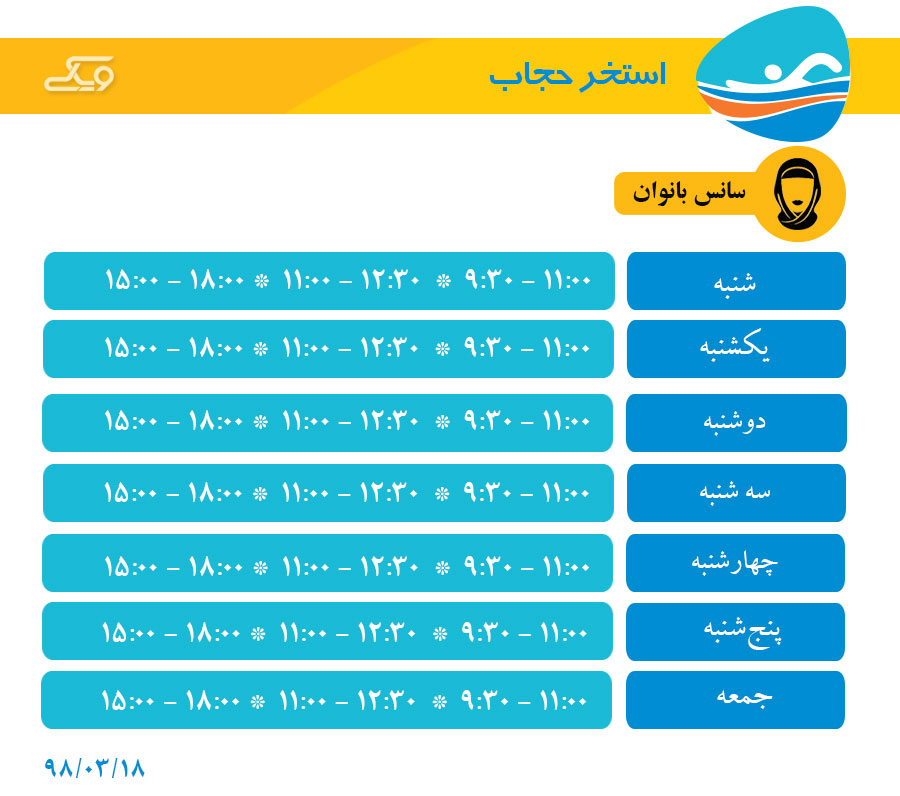 سانس بعدازظهر:۱۴۰۰۰ - امکانات:استخر اصلی، سوناخشک، سونا بخار، جکوزی، حمام ترکی، غارنمکی، ورزش در آب