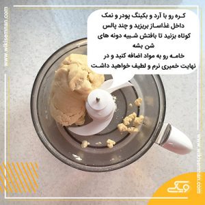 کره رو با آرد و بکینگ پودر و نمک داخل غذاساز بریزید و چند پالس کوتاه بزنید تا بافتش شبیه دونه های شن بشه