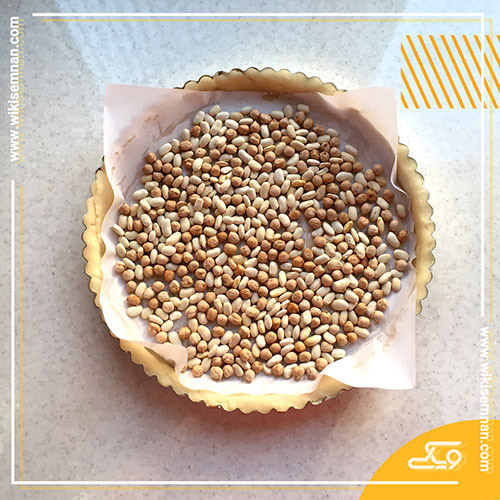 یک کاغذ روغنی روی خمیر انداخته و مقداری حبوبات روی خمیر بریزید تا خمیر پف نکند