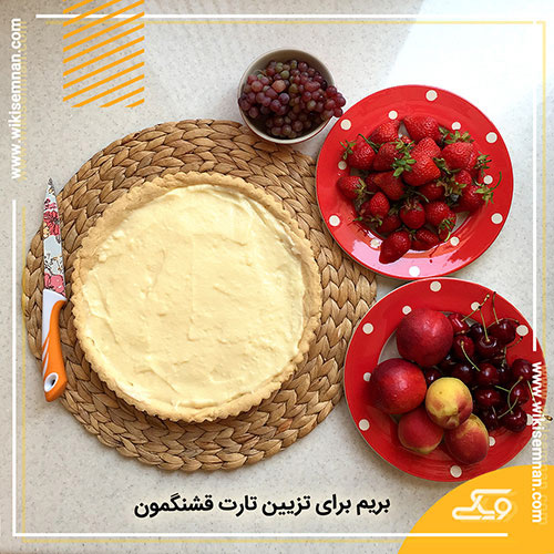 بعد کرم را داخل نان تارت ریخته و روی آن را با میوه های دلخواه تزیین میکنیم.