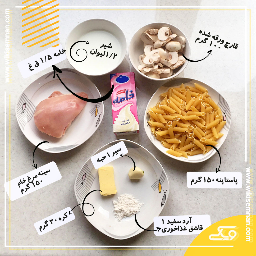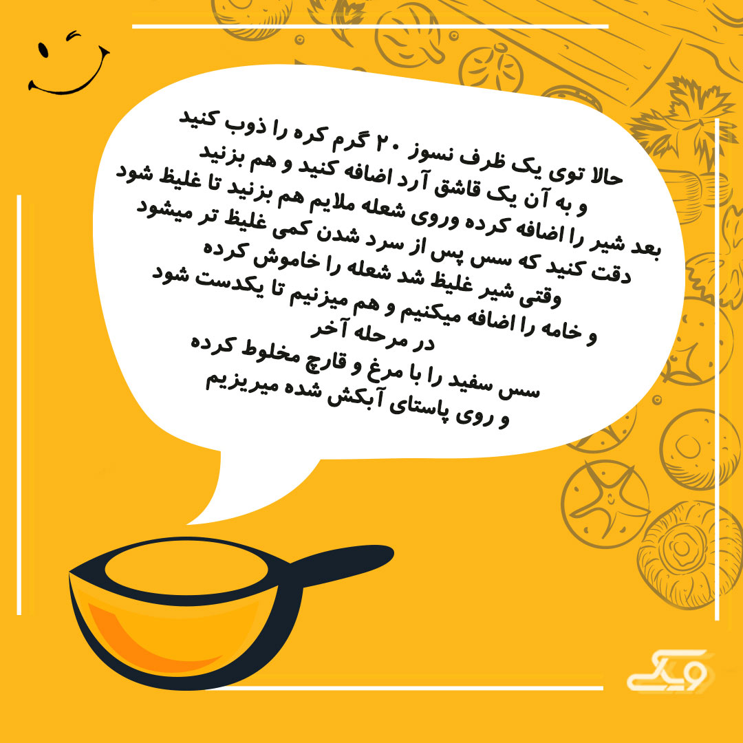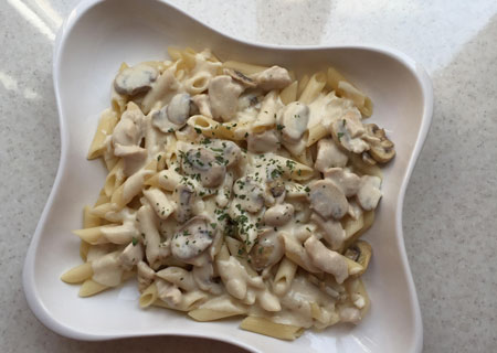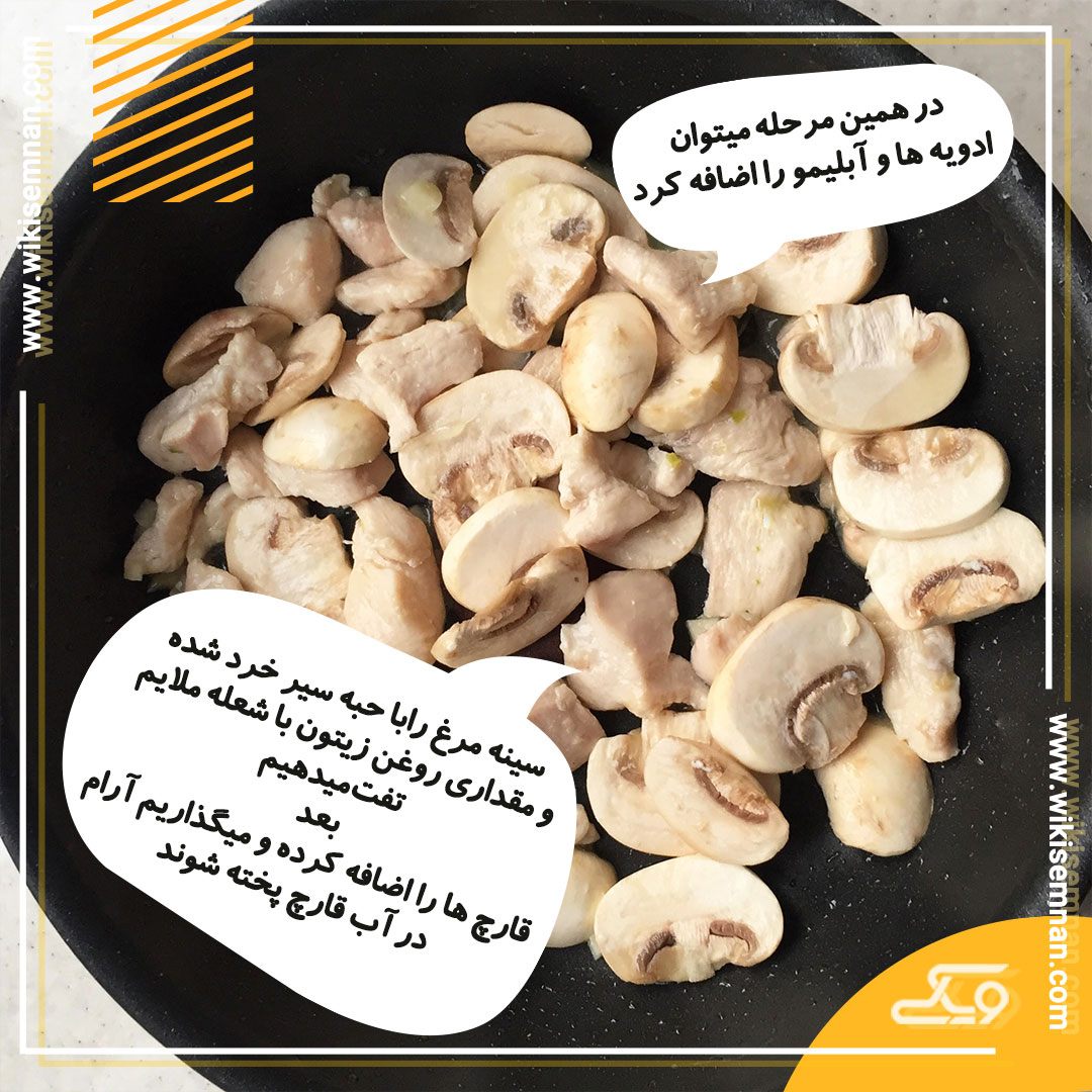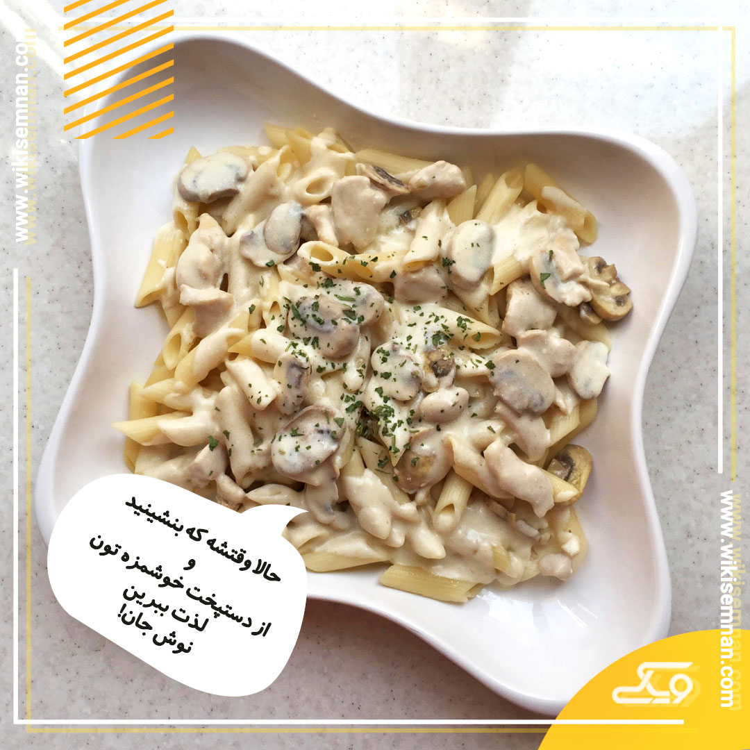 در مرحله آخر سس سفید را با مرغ و قارچ مخلوط کرده و روی پاستای آبکش شده میریزیم.