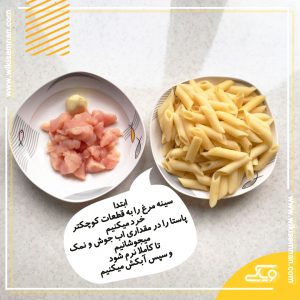 ابتدا سینه مرغ را به قطعات کوچکتر خرد میکنیم پاستا را در مقداری آب جوش و نمک میجوشانیم تا کاملا نرم شود، سپس آبکش میکنیم