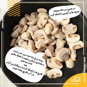 سینه مرغ را با حبه سیر خرد شده و مقداری روغن زیتون با شعله ملایم تفت میدهیم سپس قارچها را اضافه کرده و میگذاریم آرام در آب قارچ پخته شوند در همین مرحله میتوان ادویهها و آبلیمو را اضافه کرد.