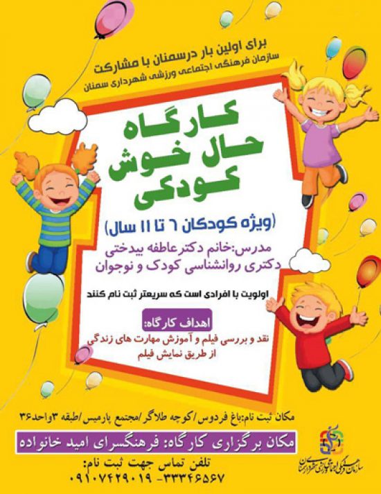 برای اولین بار در سمنان با مشارکت سازمان فرهنگی، اجتماعی، ورزشی شهرداری سمنان کارگاه حال خوش کودکی را برگزار می کند.