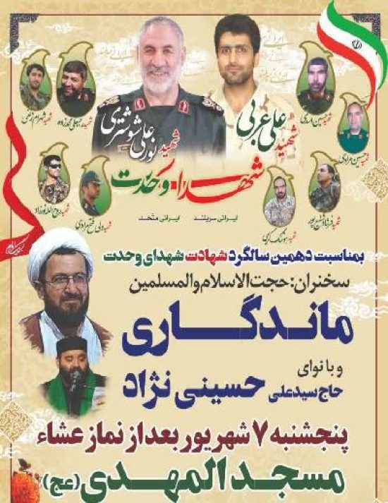 بمناسبت دهمین سالگرد شهادت شهدای وحدت منجمله شهید نورعلی شوشتری، مراسمی با سخنرانی حجت السلام والمسلمین ماندگاری و مداحی حاج سیدعلی حسین نژاد در مسجد المهدی سمنان برگزار خواهد شد.