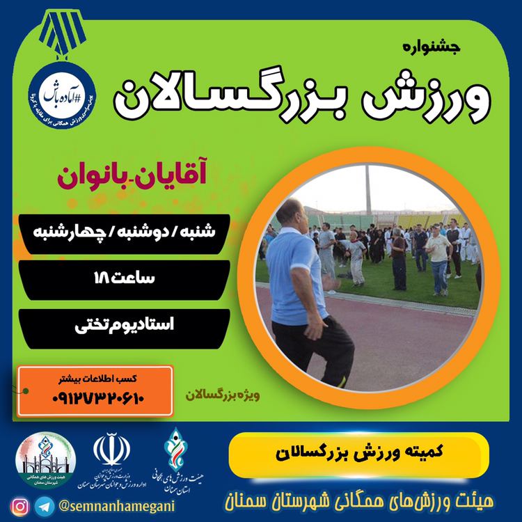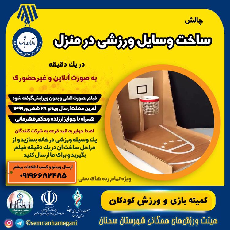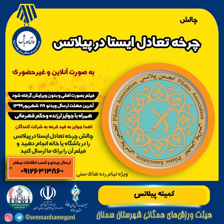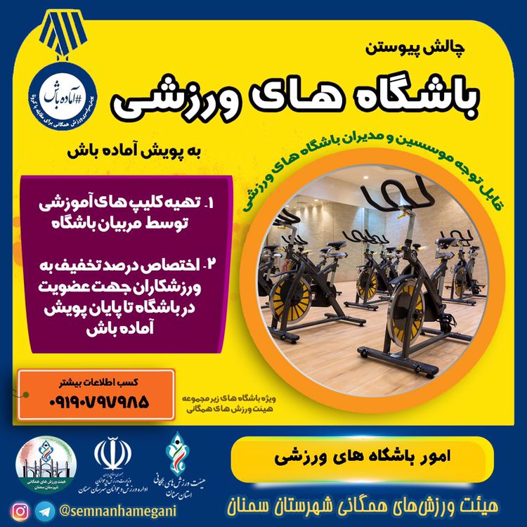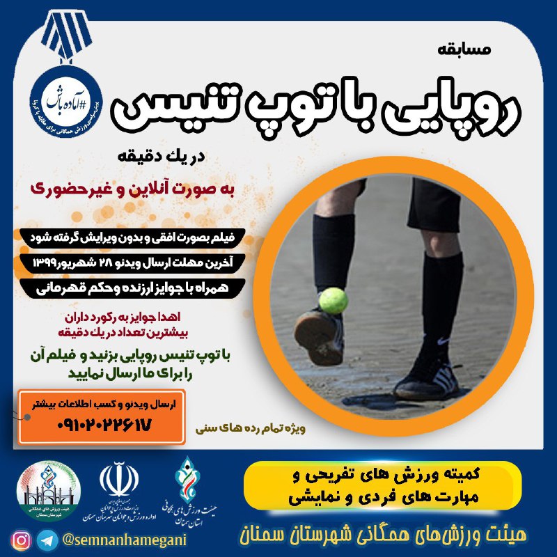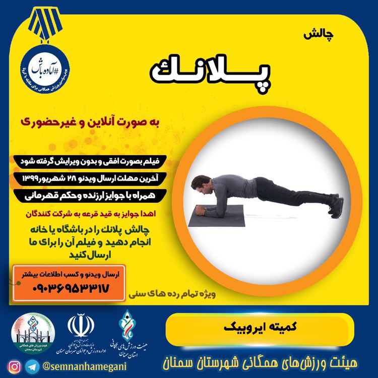 هیئت ورزش های همگانی شهرستان سمنان، پویش سراسری ورزش همگانی برای مقابله با ویروس کرونا را با نام پویش آماده باش برگزار می کند.