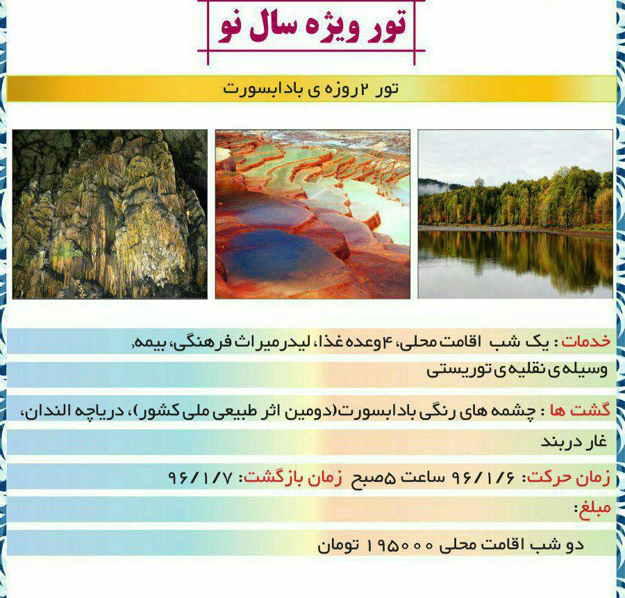 خدمات: یک شب اقامت محلی- ۴ وعده غذا- لیدر میراث فرهنگی – بیمه – وسیله نقلیه توریستی