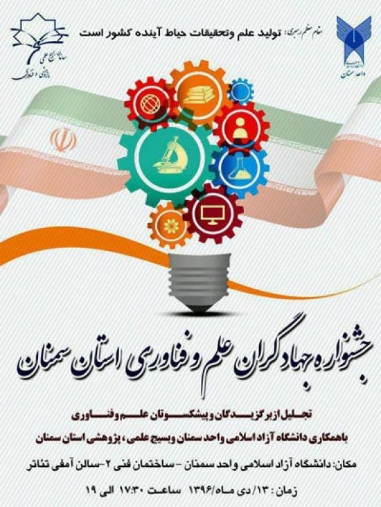 درتجلیل از برگزیدگان و پیشکسوتان علم و فناوری ، جشنواره جهادگران علم و فناوری استان سمنان با همکاری دانشگاه آزاد اسلامی واحد سمنان و بسیج علمی-پژوهشی استان سمنان برگزار می گردد.