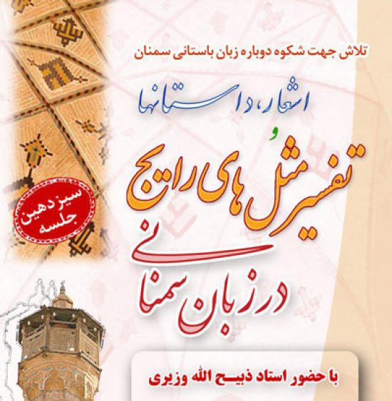 سیزدهمین جلسه تفسیر اشعار،داستان ها و مثل های رایج در زبان سمنانی با حضور استاد ذبیح الله وزیری و دیگر شاعران سمنانی،۱۱ مرداد ماه در تالار حکیم الهی فرهنگسرای کومش سمنان برگزار میگردد.