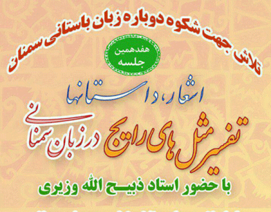 هفدهمین جلسه تفسیر اشعار،داستان ها و مثل های رایج در زبان سمنانی با حضور استاد ذبیح الله وزیری و سخنرانی مهندس احسان ابراهیمیان پیرامون زبان سمنانی،۸ آذر ماه در تالار حکیم الهی فرهنگسرای کومش سمنان برگزار میگردد.