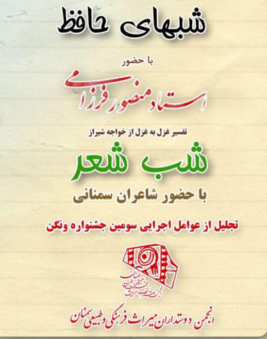 بیست و دومین جلسه شب شعر شبهای حافظ با حضور استادمنصور فرزامی و دیگر شاعران سمنانی به همراه تفسیر غزل به غزل از خواجه شیراز و تجلیل از عوامل اجرایی سومین جشنواره ونگن،۲۹ شهریور ماه در سالن حکیم الهی فرهنگسرای کومش سمنان برگزار میگردد.
