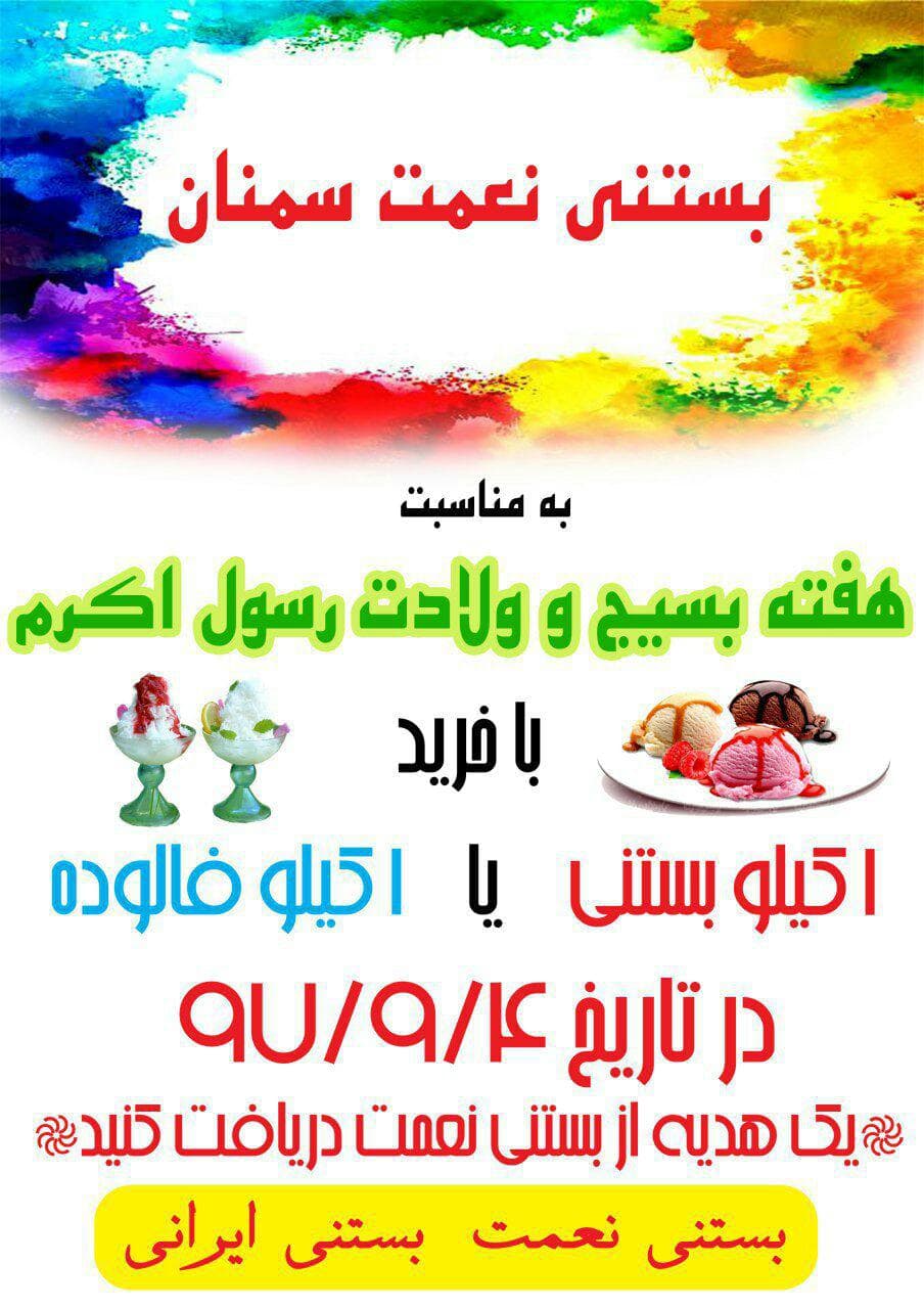 به مناسبت هفته بسیج و ولادت رسول اکرم (ص) با خرید یک کیلو بستنی یا فالوده از بستنی نعمت سمنان در تاریخ ۴ آذر ماه ۱۳۹۷، یک هدیه دریافت نمایید.