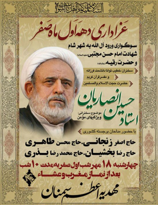 عزاداری دهه اول ماه صفر در تاریخ ۱۸ مهر ماه ۱۳۹۷ به مدت ۱۰ شب، بعد از نماز مغرب و عشاء با سخنرانی استاد حسین انصاریان با موضوع «ویژگی های مؤمن»، در مهدیه اعظم سمنان، با حضور عاشقان و دل دادگان خاندان عصمت و طهارت (ع) برگزار می شود.