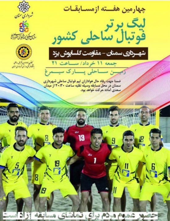 چهارمین هفته از مسابقات لیگ برتر فوتبال ساحلی کشور،بین تیم شهرداری سمنان و مقاوت گلساپوش یزد در ساعت ۲۱:۰۰،جمعه ۱۱ خرداد ماه در زمین ساحلی پارک سیمرغ برگزار میگردد.