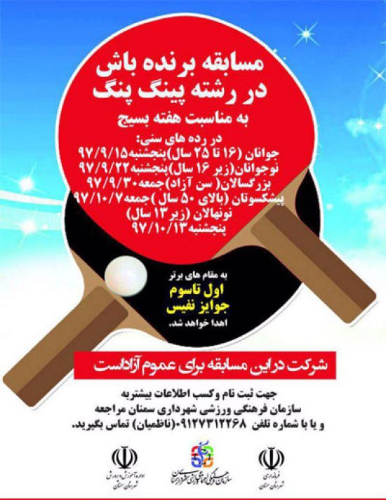 مسابقه برنده باش به مناسبت هفته بسیج از تاریخ ۱۵ آذر ماه لغایت ۱۳ دی ماه ۱۳۹۷ ساعت ۸:۳۰ صبح، مختص آقایان در رده های سنی زیر در سالن ورزشی سازمان فرهنگی ورزشی شهرداری سمنان برگزار می شود.