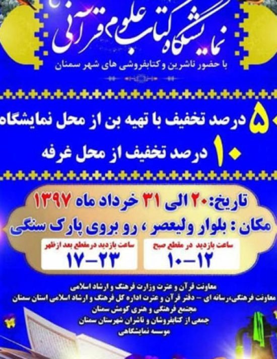 نمایشگاه کتاب علوم قرآنی با حضور ناشرین و کتابفروشیهای شهر سمنان از تاریخ ۲۰ الی ۳۱ خردادماه در بلوار ولیعصر، روبروی پارک سنگی برگزار میشود.