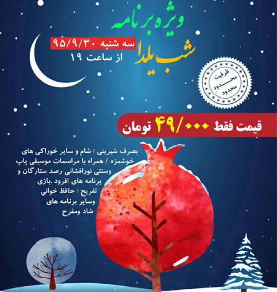 خدمات: بصرف شیرینی،شام،و سایر خوراکی های خوشمزه،همراه با مراسمات موسیقیایی پاپ و سنتی ، نورافشانی، رصد ستارگان و برنامه های افرود، حافظ خوانی و سایر برنامه های شاد و مفرح.