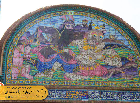 یکى از شاهکارهاى این بناى تاریخى، سردر جالب توجهى است که در آن تصویر تاریخى نبرد رستم و دیو سپید به طرزى خیرهکننده روى کاشى هفت رنگ منقوش است و دو طرف بنا منقش به تصویر سرباز قاجاری است. کتیبههاى این بنا از آثار هنرمند به نام سمنان در دوران قاجاریه، سید محمد باقر طباطبایى سمنانى و استاد علی کاشیپز کاشانی است. نامبرده از نوادگان مرحوم میرمحمد خان طباطبایى سمنانى است. درهاى دروازه ارگ از الوار قطور با گل میخهاى آهنى است که هنوز به پیروى از زمانهاى گذشته، گاهی شب هنگام آنها را مىبندند.
