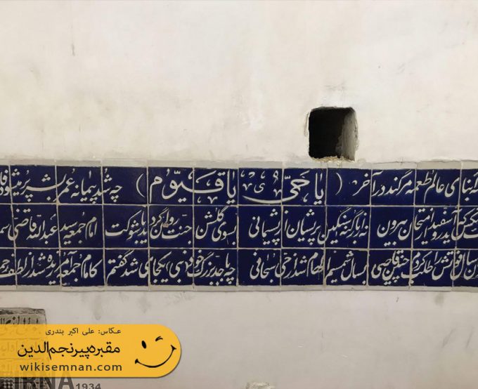 طرف دیگر اتاق سه طاقچه تو گود با طاق‌های جناغی ساخته شده که به غیر از طاقچه جنوبی که از آن با عنوان نورگیر استفاده می شود بقیه محل دفن اموات بوده است. در گوشه شمال غربی حرم، بر بالای سه سنگ قبری که حدود نیم متر از کف اتاق بلند‌تر است سه ردیف کاشی‌کاری دیده می‌شود که اشعاری به خط سفید بر متن لاجوردی درباره مدفونین آن قبرها نوشته شده است.