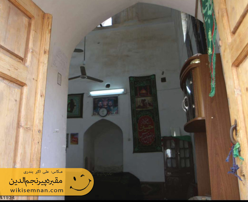قسمت غربی حرم و رو به قبله، محراب بلند و سادهای به چشم میخورد که چیزی جز یک فرو رفتگی بیش نیست و در سه گوشه بقعه طاقچههای بسیار کوچکی جهت روشن کردن شمع ایجاد نمودهاند. روبروی آرامگاه پیر نجمالدین دو ستون خشتی بسیار بزرگ از خشت خام وجود دارد که برخی از مردم آن را مقبره فرزندان امیر تیمور گورکانی میدانند.