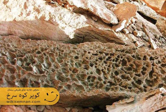 کوه سرخ، به علت ساختارهایی زیبایی که حاصل سه عامل باد، خاک و آب هستند بسیار دیدنی است و از آن جمله میتوان به همای سعادت اشاره کرد. این صخره بر اثر وزش باد به شکل یک عقاب بسیار زیبا درآمده است. این صخره از بالا به شکل عقابی است که بالهای خود را به صورت نیمه باز درآورده و شاید کسی باور نکند که این منظره به صورت طبیعی شکل گرفته است و ساخته دست انسان نیست. همای سعادت، نامی است که مهندس عنایتالله رنجبر، استاد دانشگاه، طبیعت گرد، جهانگرد سمنانی و کاشف این صخره، بر روی آن گذاشته است.